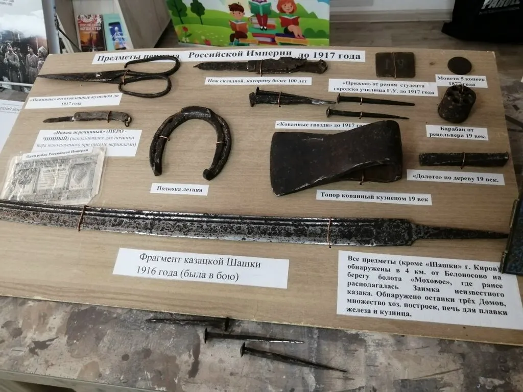 Казачьи иконы, одна из которых датирована 1853 годом. Предметы времён Гражданской войны: гильзы от винтовки Мосина (1917–1919 гг.), найденные на местах боёв между поселками Белоносово и Бектыш. Удивили предметы быта, найденные на болоте «Моховое»: кованые гвозди, подковы, ножницы, ножи. Краевед рассказал, что здесь когда-то была заимка казака и даже плавильня железа!